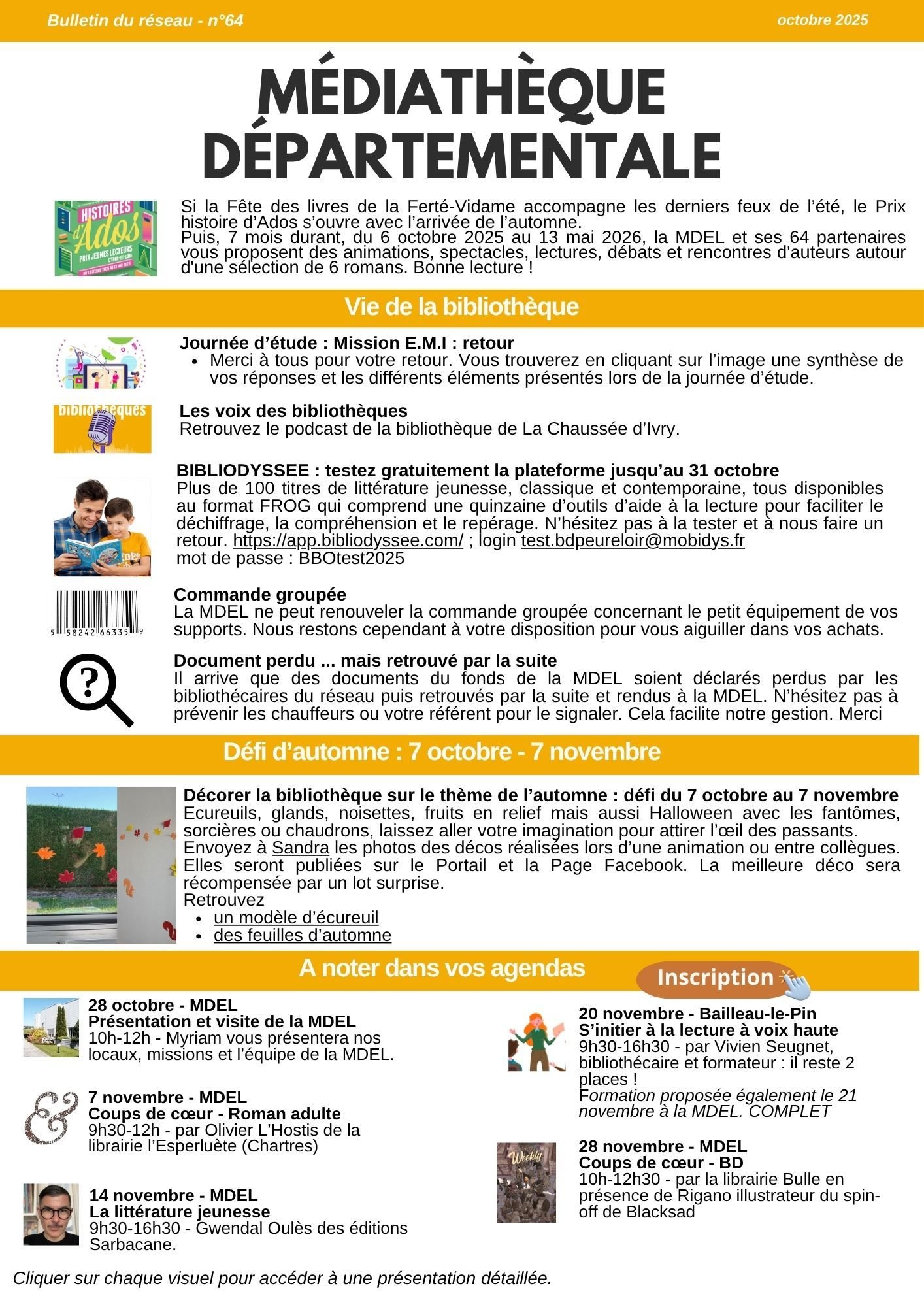 Au sommaire : Prix Histoires d'ados, retour sur la journée d'étude, les voix des bibliothèques, Bibliodyssée, commande groupée, document perdu, défi d'automne, à noter dans votre agenda