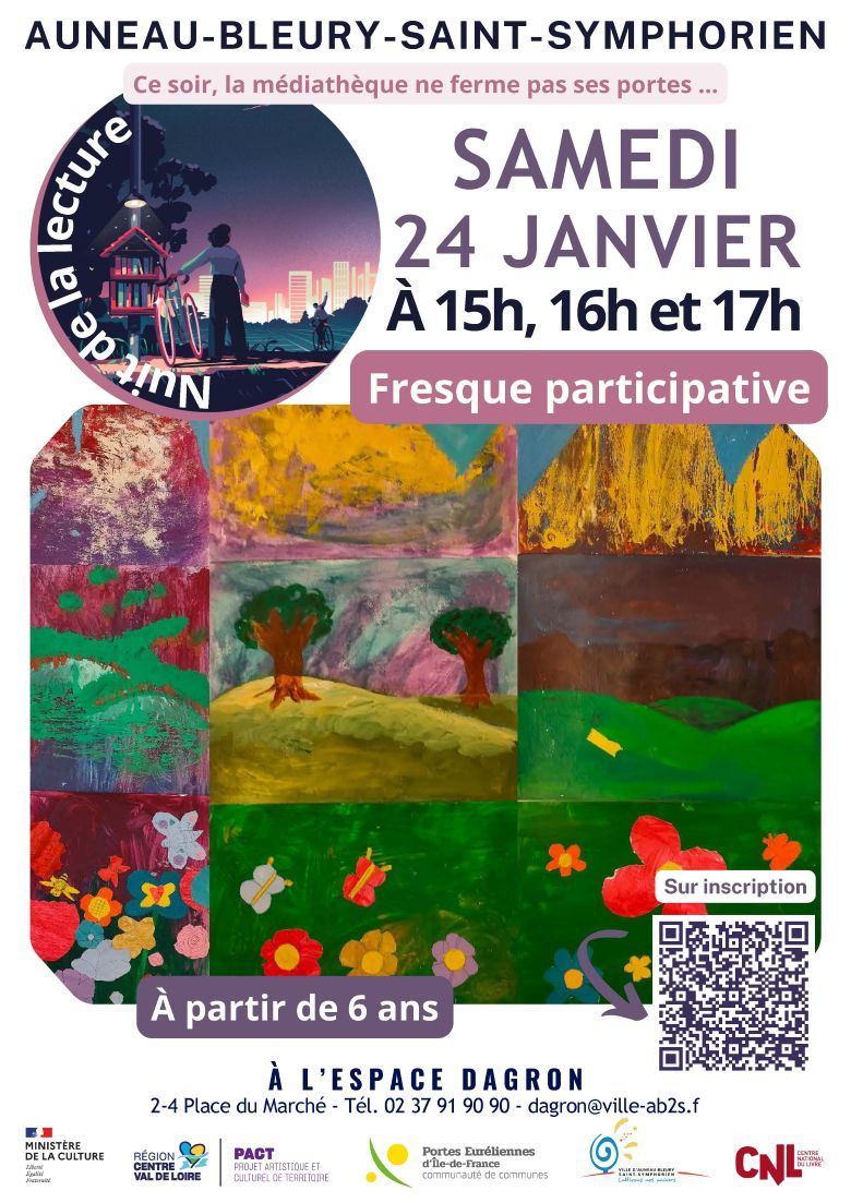 A l'occasion des Nuits de la lecture, l'artiste Lionel CHARDINE, Professeur d'arts visuels, proposera 1 atelier fresque participative avec 3 créneaux successifs. Un agréable moment de création artistique à vivre en famille (atelier intergénérationnel). Accompagnés par l’artiste, les participants contribueront à une fresque collective autour du thème « Villes et campagnes ».