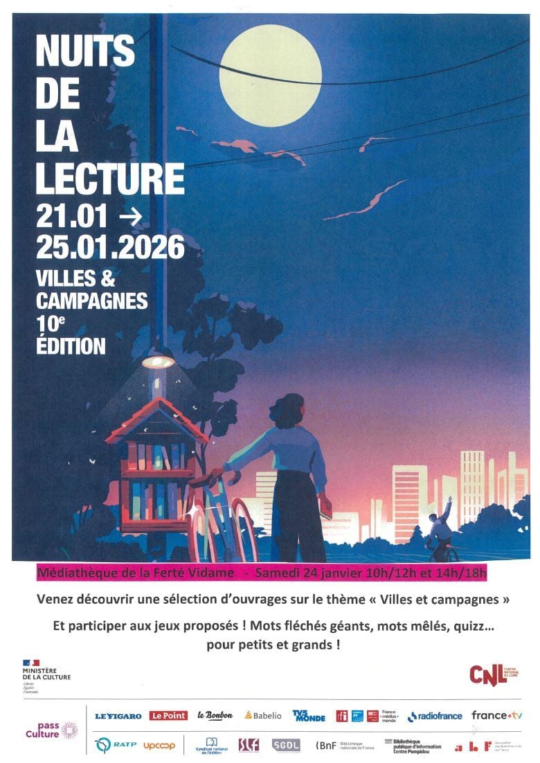 Dans le cadre de la 10ème édition des Nuits de la Lecture venez découvrir une sélection d'ouvrages sur le thème "Villes et campagnes" et participer aux jeux proposés !