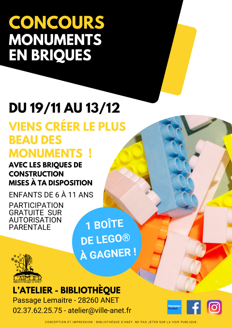 La bibliothèque organise un concours « Monuments en briques ». Viens imaginer le plus beau des monuments avec les briques de construction mises à ta disposition. La plus belle création remportera une boîte de construction LEGO® !